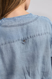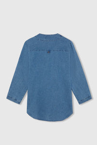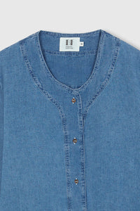 Camicia girocollo con tessuto in misto lino e cotone dall'effetto denim. La camicia ha i bottoni, leggermente più lunga e svasata sul retro, la manica lunga sopra il polso e dettagli di cuciture su tutti i profili.