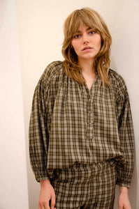Camicia in cotone intrecciato tinto in capo, molto morbida e con la manica raglan e leggermente arricciate nella parte superiore.