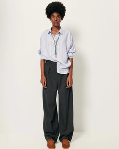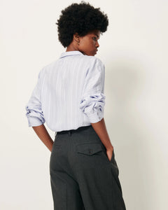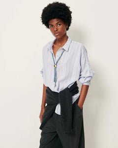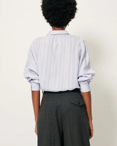 Camicia a spalle scese arricciate in percalle di viscosa leggera a righe dobby, esclusiva di Sessùn. La camicia ha la chiusura con l'ultimo bottone gioiello sul colletto.