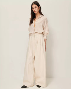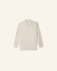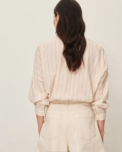 Camicia a spalle scese arricciate in tessuto morbido con sottili strisce a contrasto, esclusiva di Sessùn. La camicia ha la chiusura con l'ultimo bottone gioiello sul colletto.