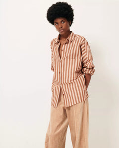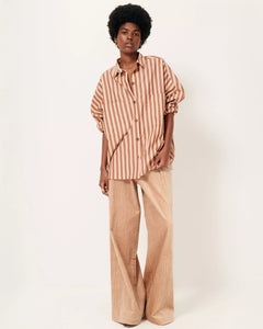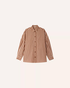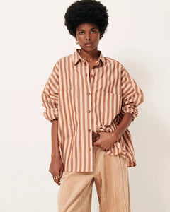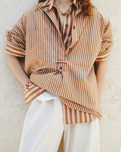 Camicia oversize con tasche applicate in popeline di cotone a righe bicolore, tessuta in Italia, esclusiva di Sessùn. La camicia ha la chiusura a bottoni con un bottone gioiello sulla linguetta del colletto. Togo cucito sul retro con una linguetta a bottone e dettagli a pieghe