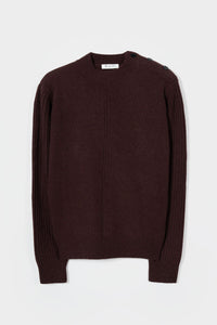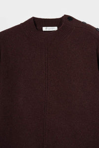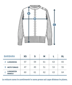 Barbara è realizzata in punto maglia rasato nel corpo e le maniche a coste con un collo tondo alto rifinito. Il dettaglio dato dalla particolare lavorazione delle calature centrali crea un elegante effetto cucitura sul davanti, mentre i bottoni sulla spalla aggiungono carattere.